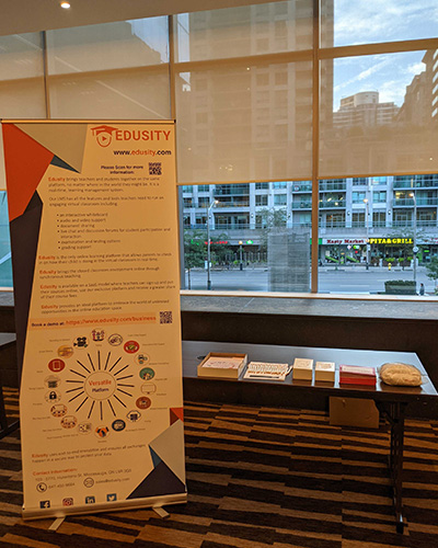 The time to create and show off materials that explain Edusity’s role in online education is finally here! This feature board is our first presentation piece. Visitors to our booth also got an Edusity mask, a pen, an